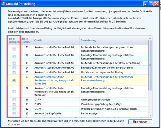 Aktivieren Sie das Häckchen in der Spalte "Block anzeigen" und klicken anschließend auf übernehmen. Wird kein Block aktiviert, erfolgt die Anzeige wieder als hierarchische Tabelle.